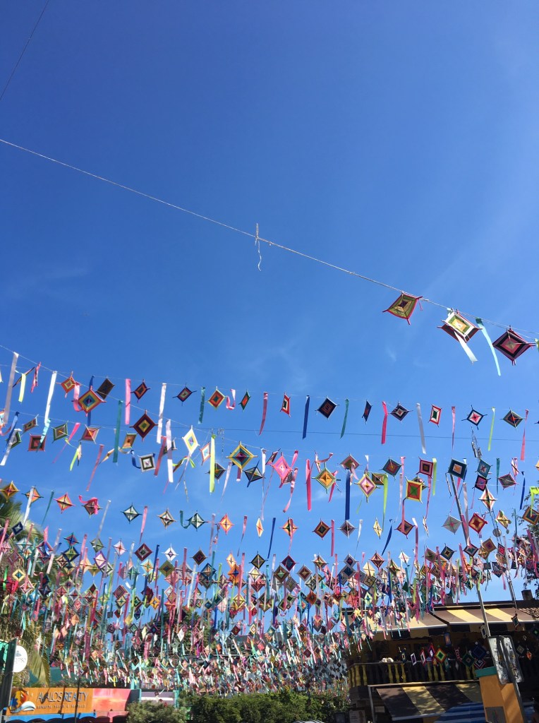 Sayulita has many shops to buy souvenirs including ceramics and paper shops where you can buy mandelas and plastic or paper Mexican banners. For 50 pesos, I brought these back and they now hang on my patio.