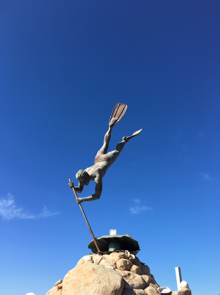 If you fancy exploring little local towns, I would recommend Bucerias, 15 minutes north of Nuevo Vallarta and easily accessible by local bus or taxi. This little place boasts a strip of markets and restaurants leading to the windy ocean where you encounter a marvelous steel, bronze statue of a deep sea diver spearing oysters.